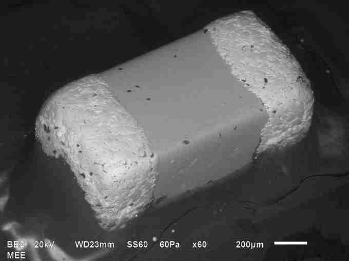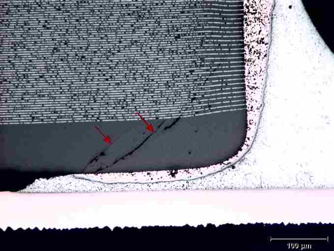 No cracks nor other anomalies were observed by the as-received SEM inspection. However, metallographic sectioning and light microscopy revealed cracks at the bottom corners of several capacitors. The cracks ran from the edge of the termination toward the end face of the MLCC. The cracks were not visible by SEM of the as-received samples because the cracks were contained within the MLCC ceramic and did not extend through the end metal termination and solder. Additionally, the cracks extended toward the PCB and thus would not be visible without removing the capacitors from the PCB.