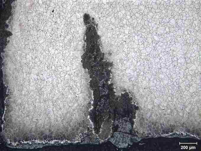 The typical microstructure for the plates consisted of equiaxed austenite grains, which was the expected microstructure for a austenitic stainless steel alloy, such as type 304. However, there was an unusually high concentration of carbides. These carbides became more concentrated in a gradient toward the original outer surfaces of the plates. This gradient distribution and high concentration of carbides is characteristic of degradation by carburization.